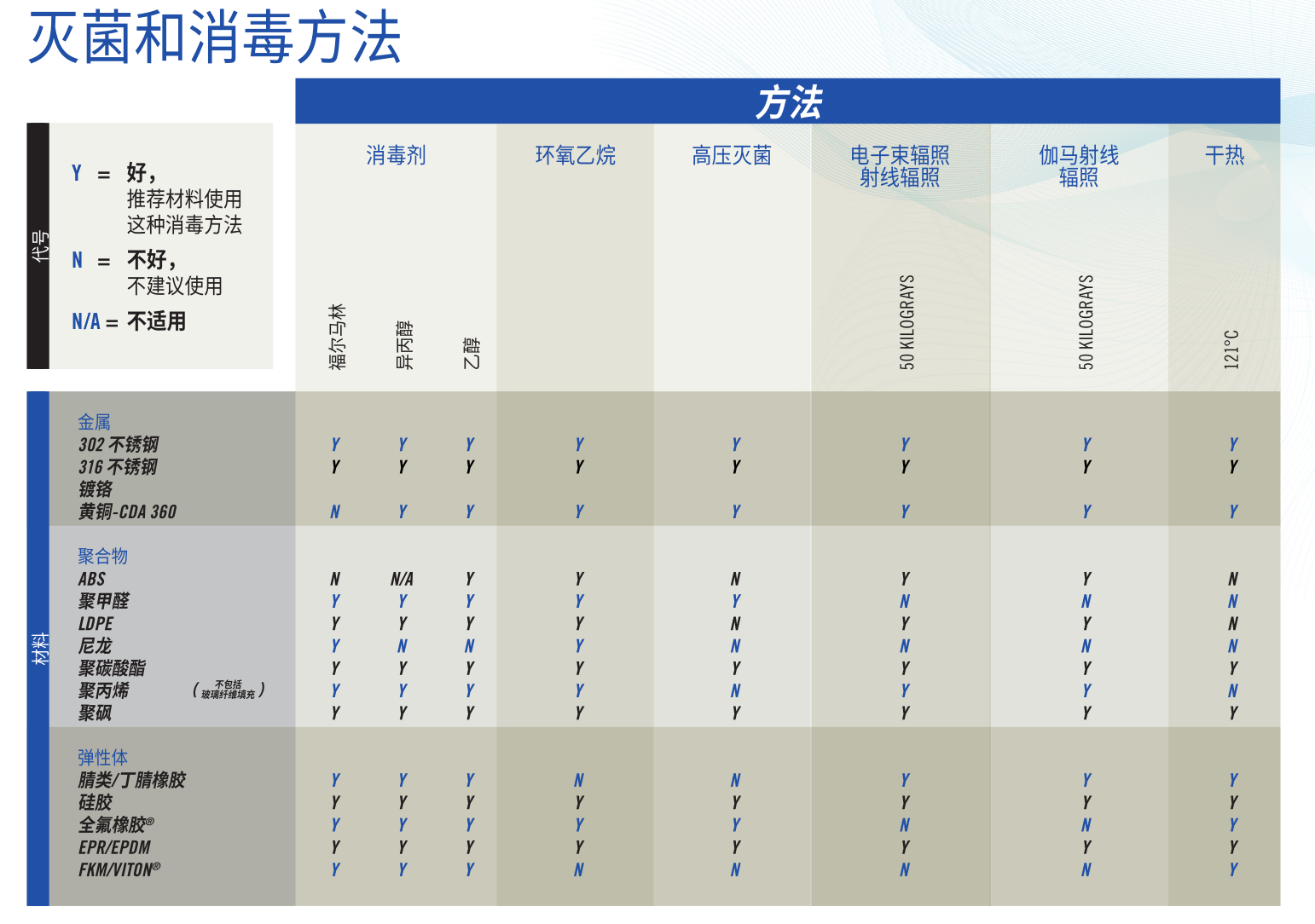 消毒劑: 20°C ,福爾馬林,乙醇等。連接或未連接滅菌。環(huán)氧乙烷, ETO : 100% EtO @ 43°C 消毒四小時,最多重復(fù)五次。連接或未連接時消毒。